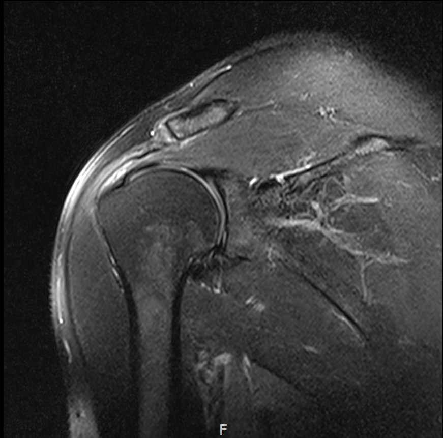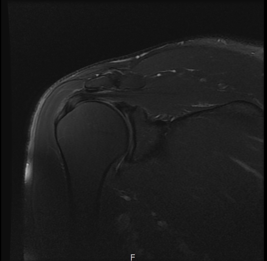 MRI: 극상건 복합 파열 (점액낭면 + 관절면)